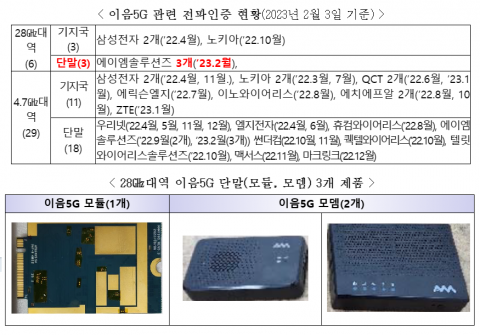 과학기술정보통신부는 28㎓대역 이음5G에 사용될 단말(무선 모듈/모뎀)에 대해 방송통신기자재 등의 적합성평가(이하 전파인증) 인증서를 신규 발급했다고 7일 밝혔다. 28㎓대역 이음5G 단말의 전파인증 발급은 국내 최초다. 28㎓ 대역을 활용한 클라우드 기반 로봇·차...